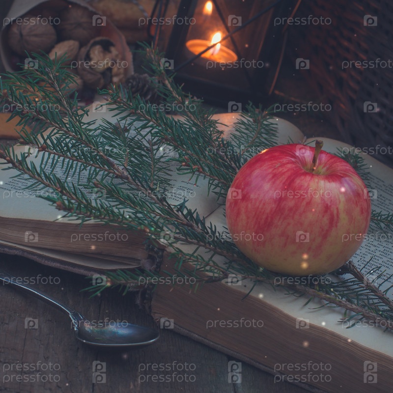 Яблоко на ветке с рождественской елкой и старой книгой