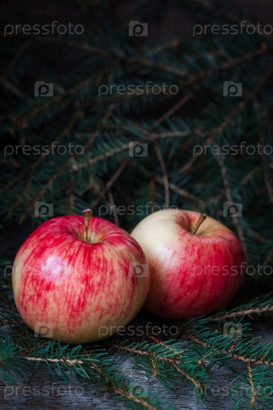 Красно-желтые яблоки на ветвях ели