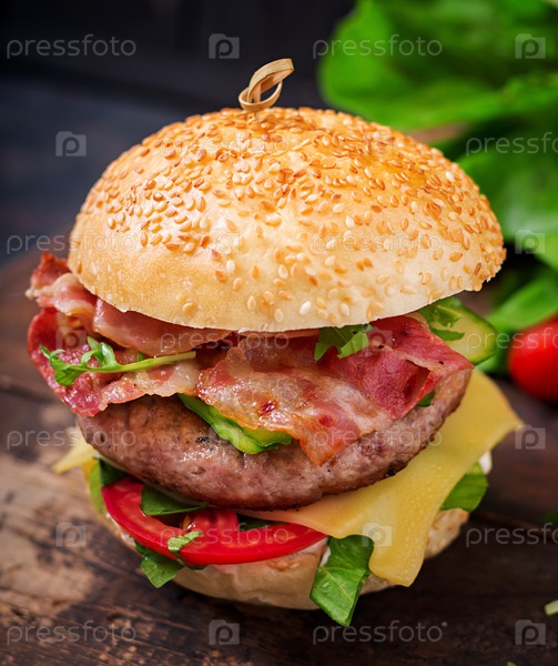 Большой гамбургер с говядиной, сыром, помидорами, огурцами и жареным беконом
