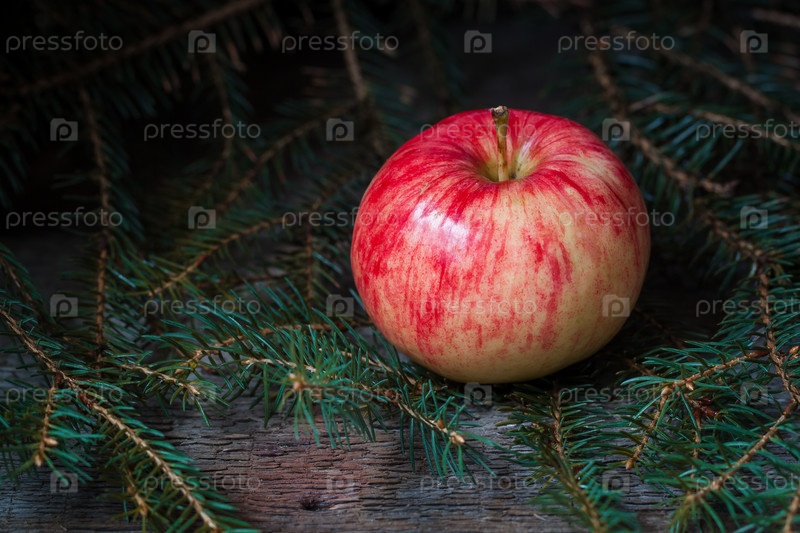 Красно-желтое яблоко на ветвях ели