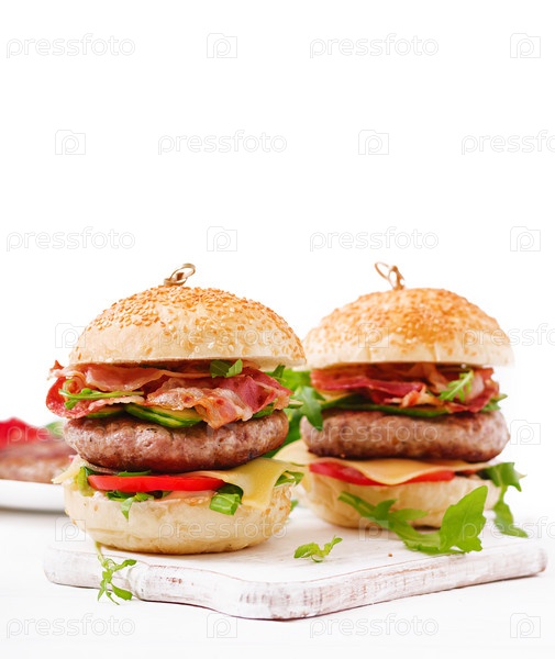 Гамбургеры с говядиной, сыром, помидорами, огурцами и жареным беконом