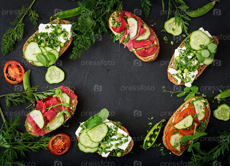 Разнообразие здоровых бутербродов на темном фоне