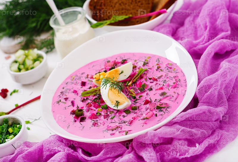 Холодный свекольник на йогурте с яйцом, луком и огурцами