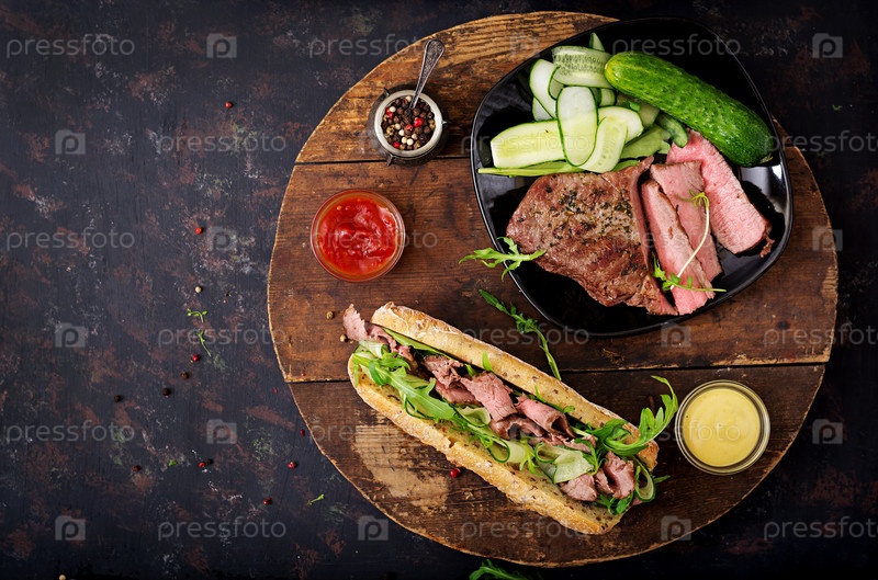 Сэндвич с жареной говядиной, огурцами и рукколой