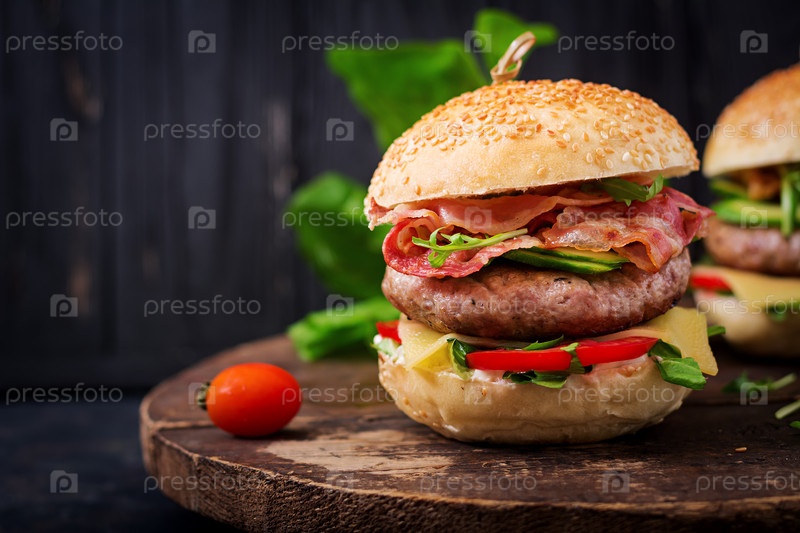 Гамбургеры с говядиной, сыром, помидорами, огурцами и жареным беконом