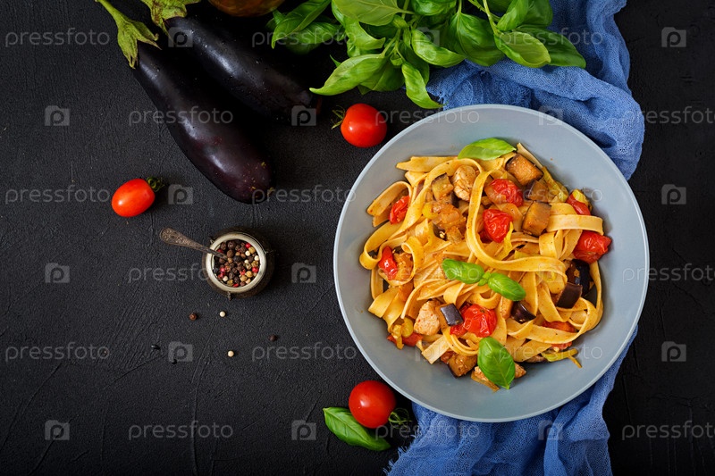 Паста Феттучини с соусом из помидоров, баклажанов и куриного филе