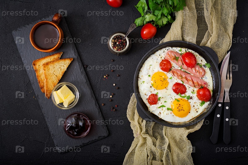 Английский завтрак - жареные яйца, помидоры и колбаса