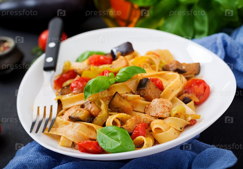 Паста Феттучини с соусом из помидоров, баклажанов и куриного филе