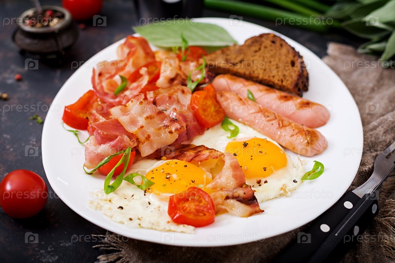 Английский завтрак - яичница, колбаса, помидоры, бекон и тосты