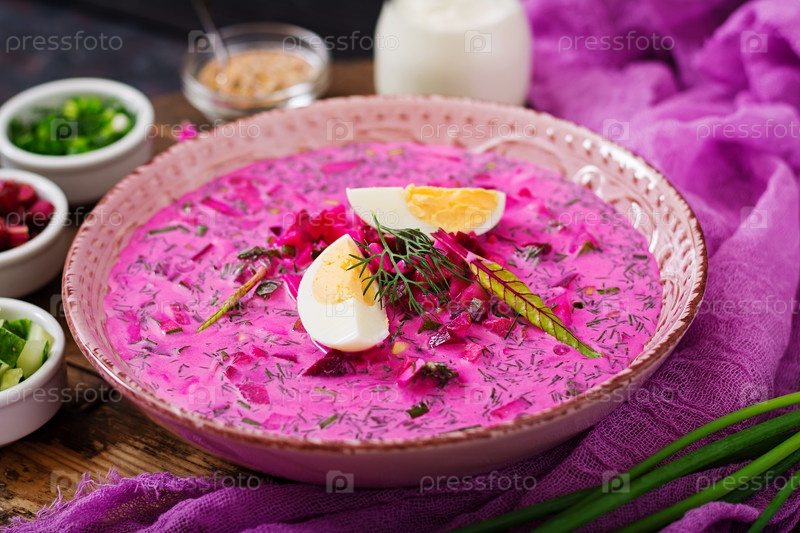 Холодный свекольник на йогурте с яйцом, луком и огурцами