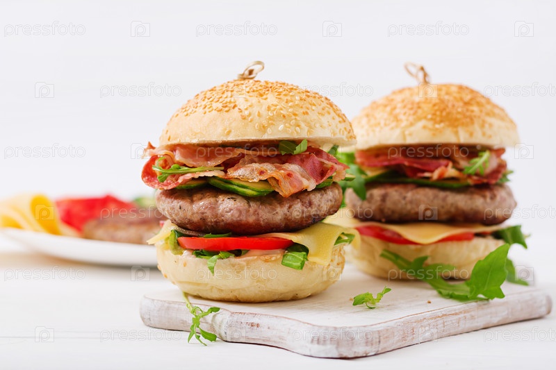 Гамбургеры с говядиной, сыром, помидорами, огурцами и жареным беконом
