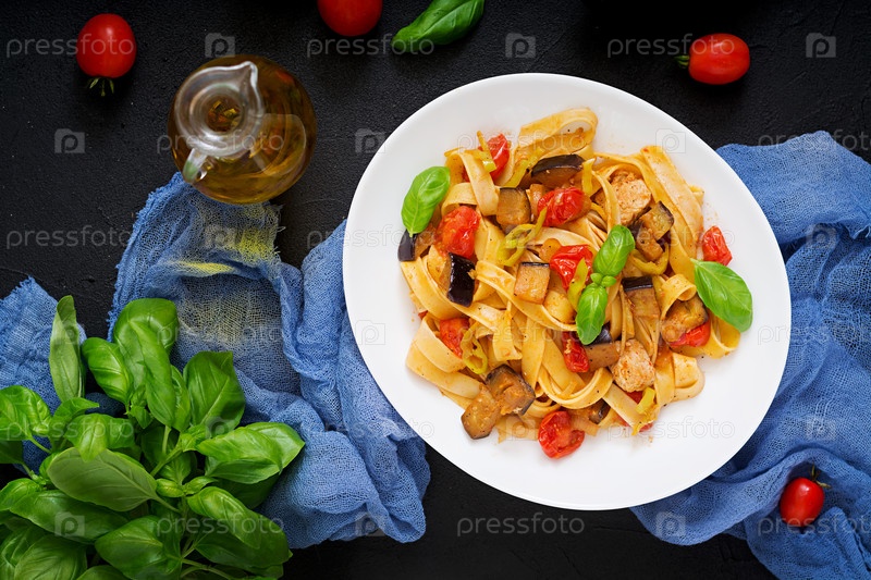 Паста Феттучини с соусом из помидоров, баклажанов и куриного филе