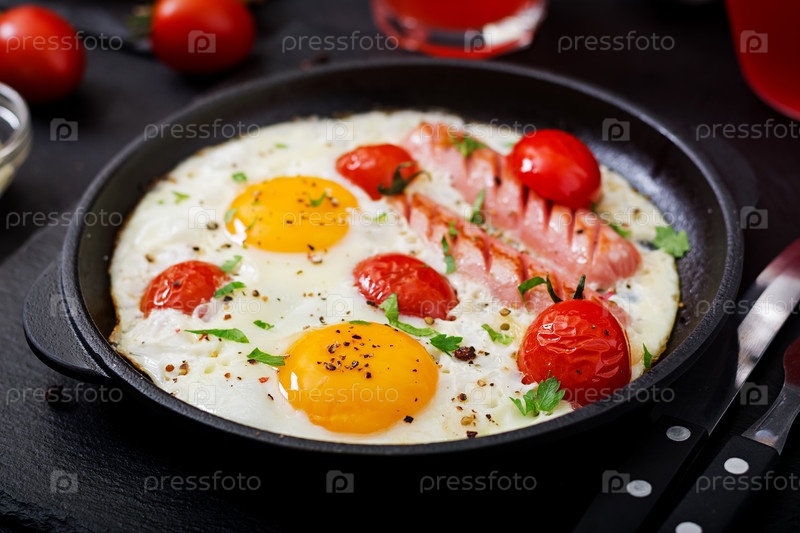 Английский завтрак - жареные яйца, помидоры и колбаса