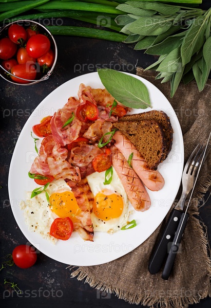 Английский завтрак - яичница, колбаса, помидоры, бекон и тосты