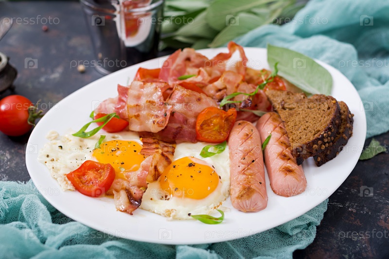 Английский завтрак - яичница, колбаса, помидоры, бекон и тосты