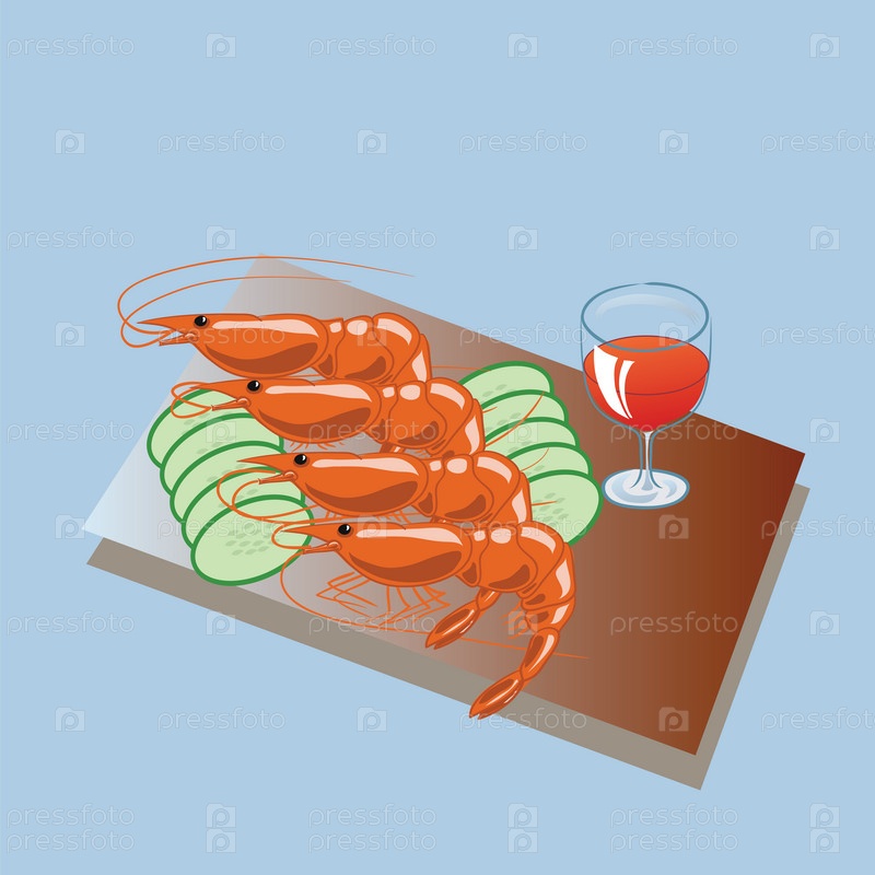 Креветки и вино на синем фоне
