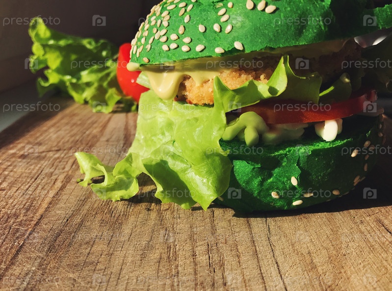 Экзотический зеленый гамбургер в булочке с кунжутом
