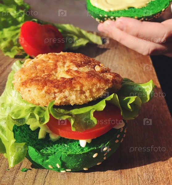 Экзотический зеленый гамбургер в булочке с кунжутом