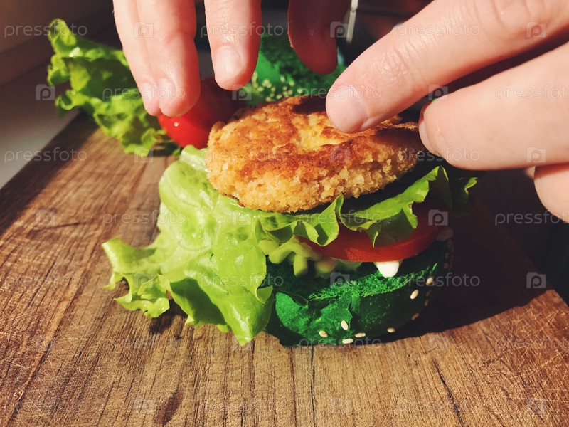 Экзотический зеленый гамбургер в булочке с кунжутом
