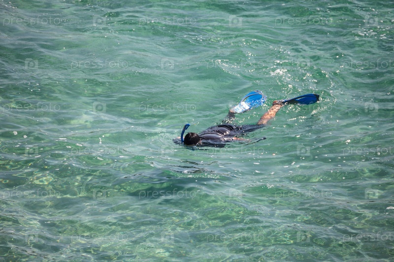 Дайвер в поисках рыбы в теплых водах
