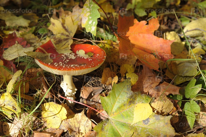Красный мухомор в осенней листве