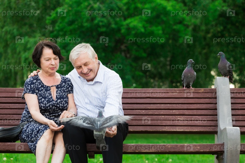 Красивая пожилая пара кормит голубей