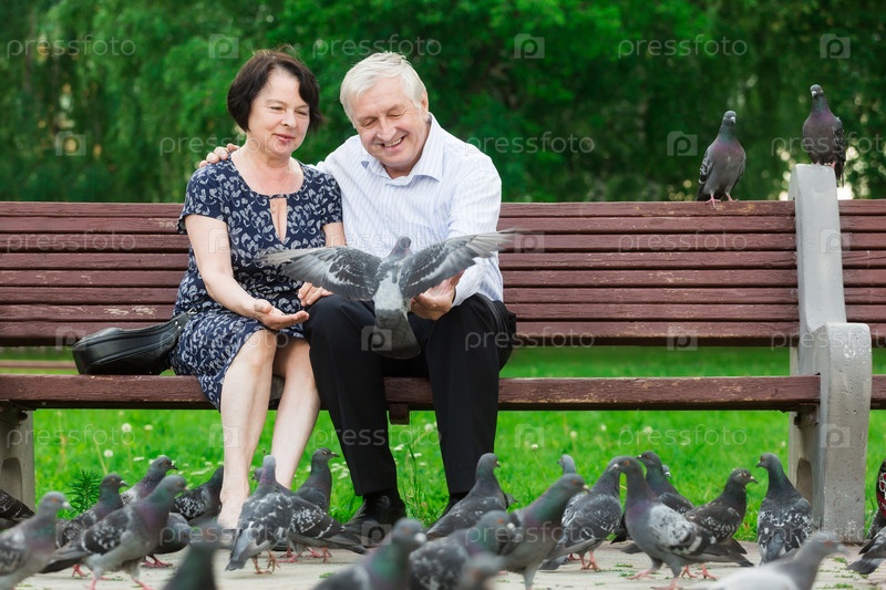 Красивая пожилая пара кормит голубей