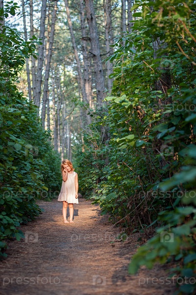 Рыжая девочка в розовом платье на тпропинке леса
