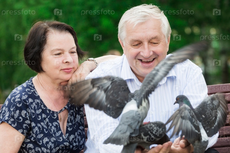 Красивая пожилая пара кормит голубей