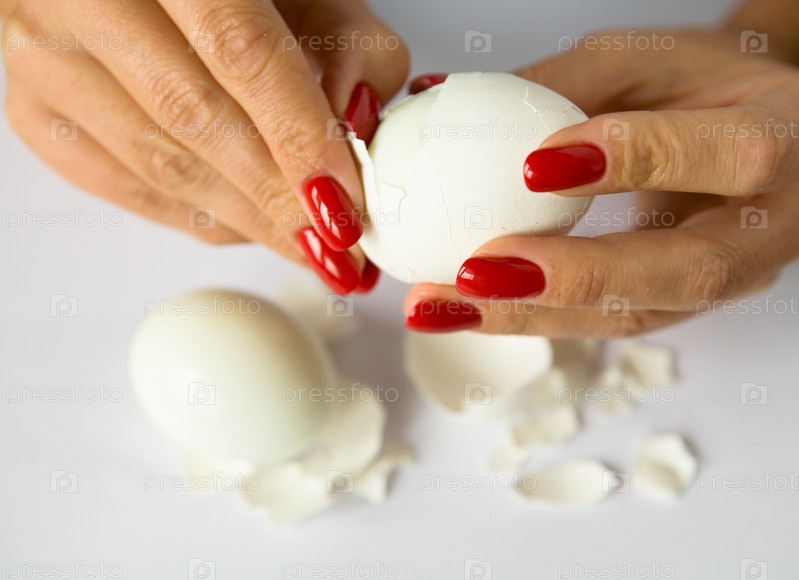 Женские руки с красивым маникюром чистят куриное яйцо