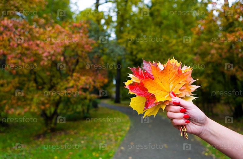 Букет из влажных разноцветных листьев в женской руке