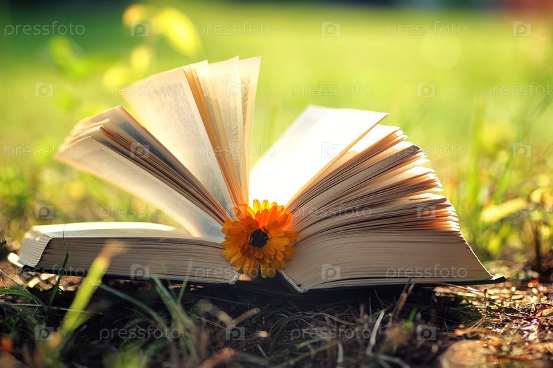 Открытая книга с цветком на траве