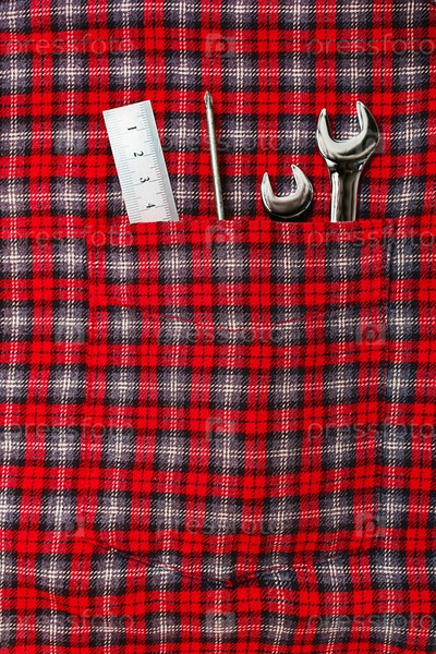 Ручные инструменты в кармане клетчатой рубашки