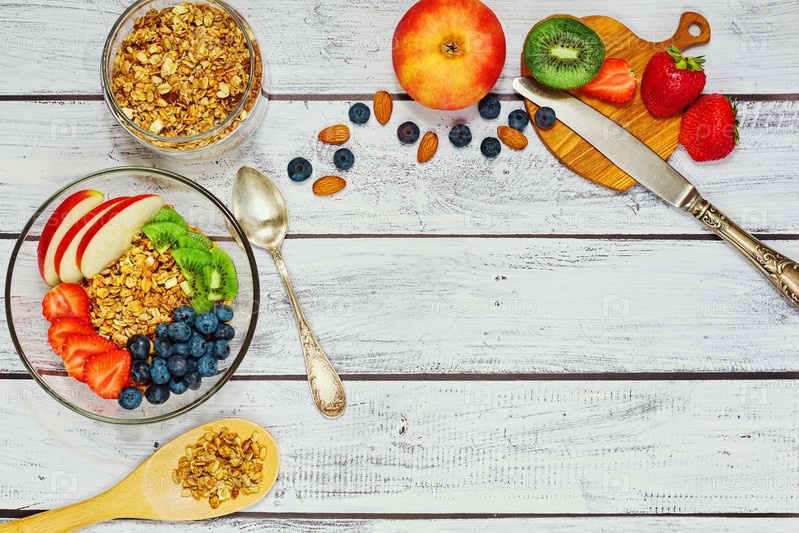 Здоровый завтрак в сельском стиле с мюсли и фруктами