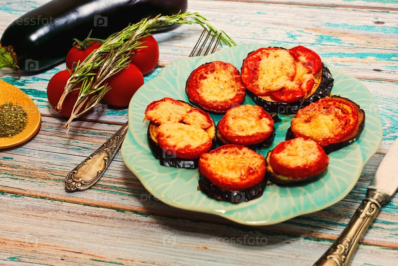 Жареные баклажаны с помидорами и сыром