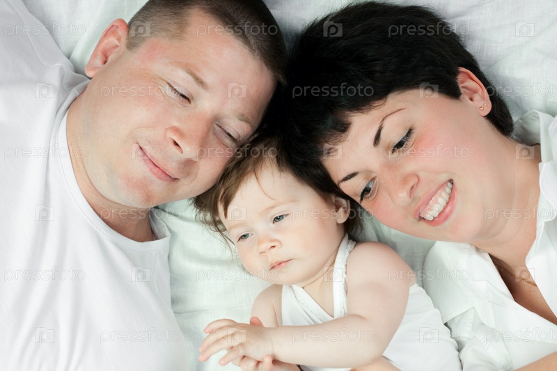 Счастливая семья - мать, отец и ребенок на белом фоне
