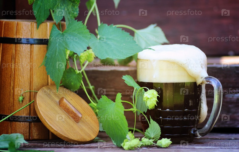 Зеленое пиво с деревянной бочкой