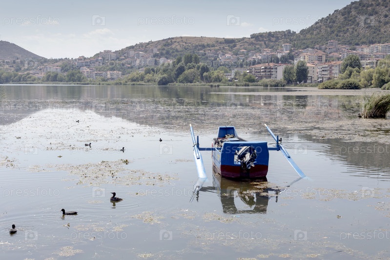 Лодка на фоне озера Орестиада в городе Касторья, Македония