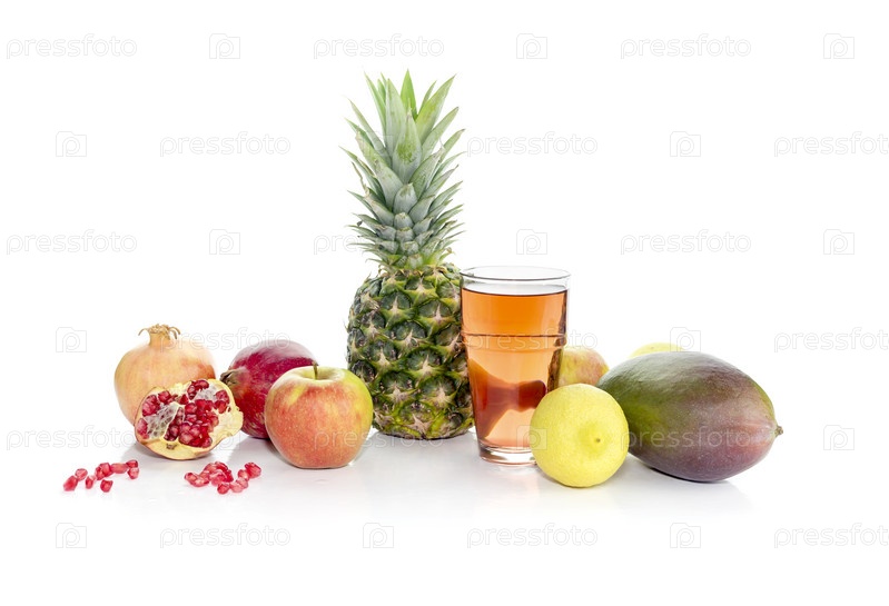 Фрукты и фруктовый сок на белом фоне