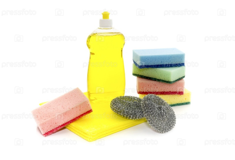 Яркие кухонные мочалки и моющее средство