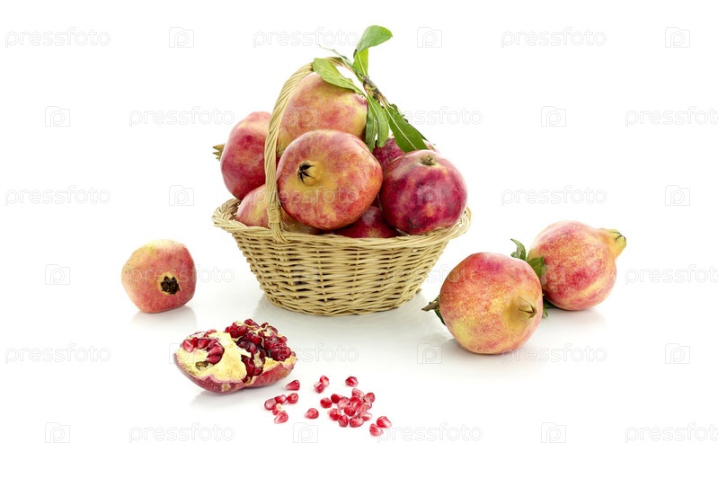 Гранаты в плетеной корзине на белом фоне