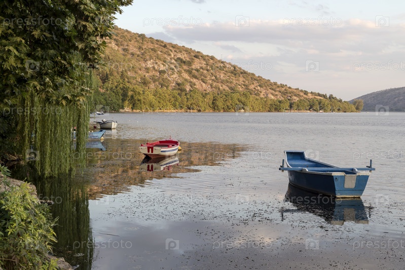 Лодка на фоне городского озера Орестиада в городе Касторья