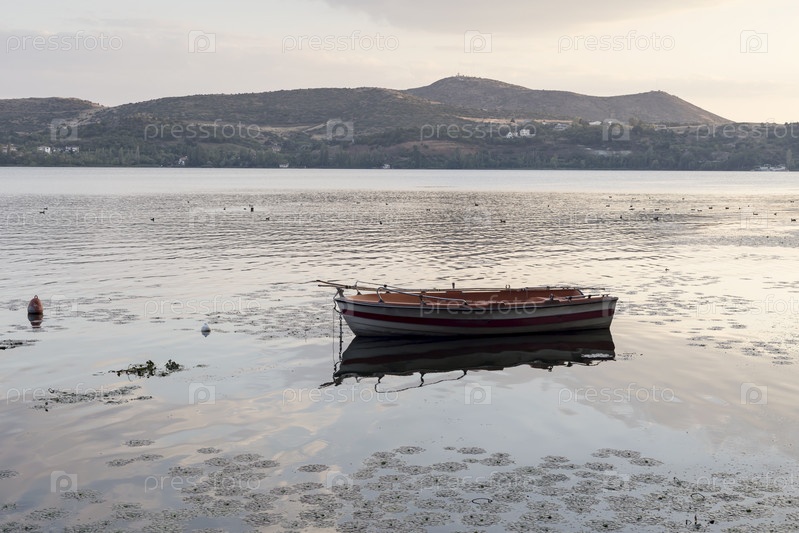 Лодка на фоне городского озера Орестиада в городе Касторья