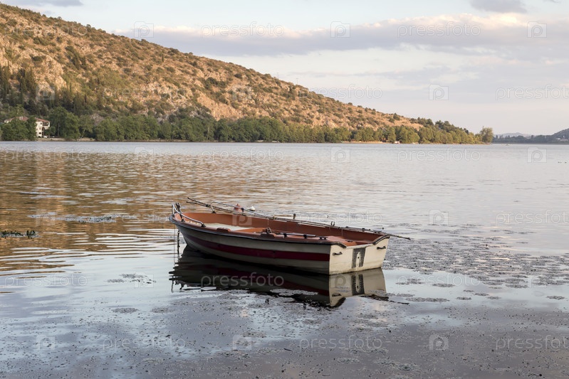 Лодка на фоне городского озера Орестиада в городе Касторья