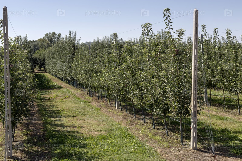Сельское хозяйство. Ряды яблони растут в горах