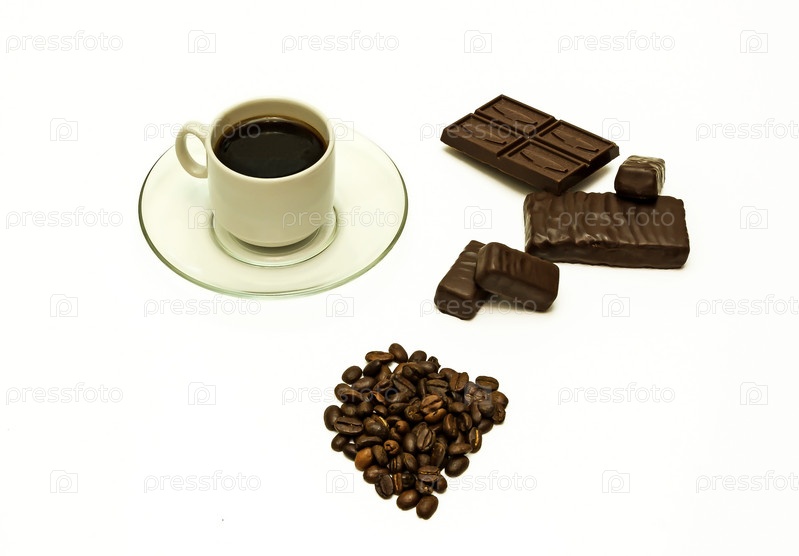Зерна кофе, чашка кофе, шоколад и шоколадные конфеты