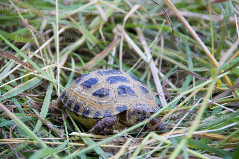 Маленькая черепаха ползет в высокой траве исследовать мир