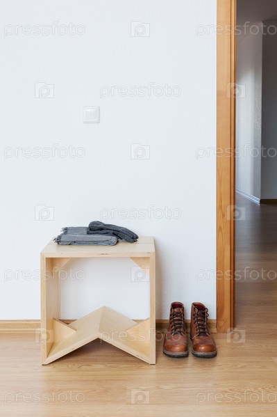 Белый пустой коридор с деревянной табуреткой и кожаными сапогами