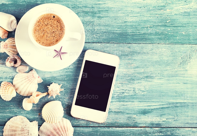 Чашка кофе, раковины и мобильный телефон