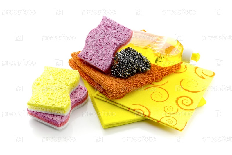 Яркие кухонные мочалки и моющее средство
